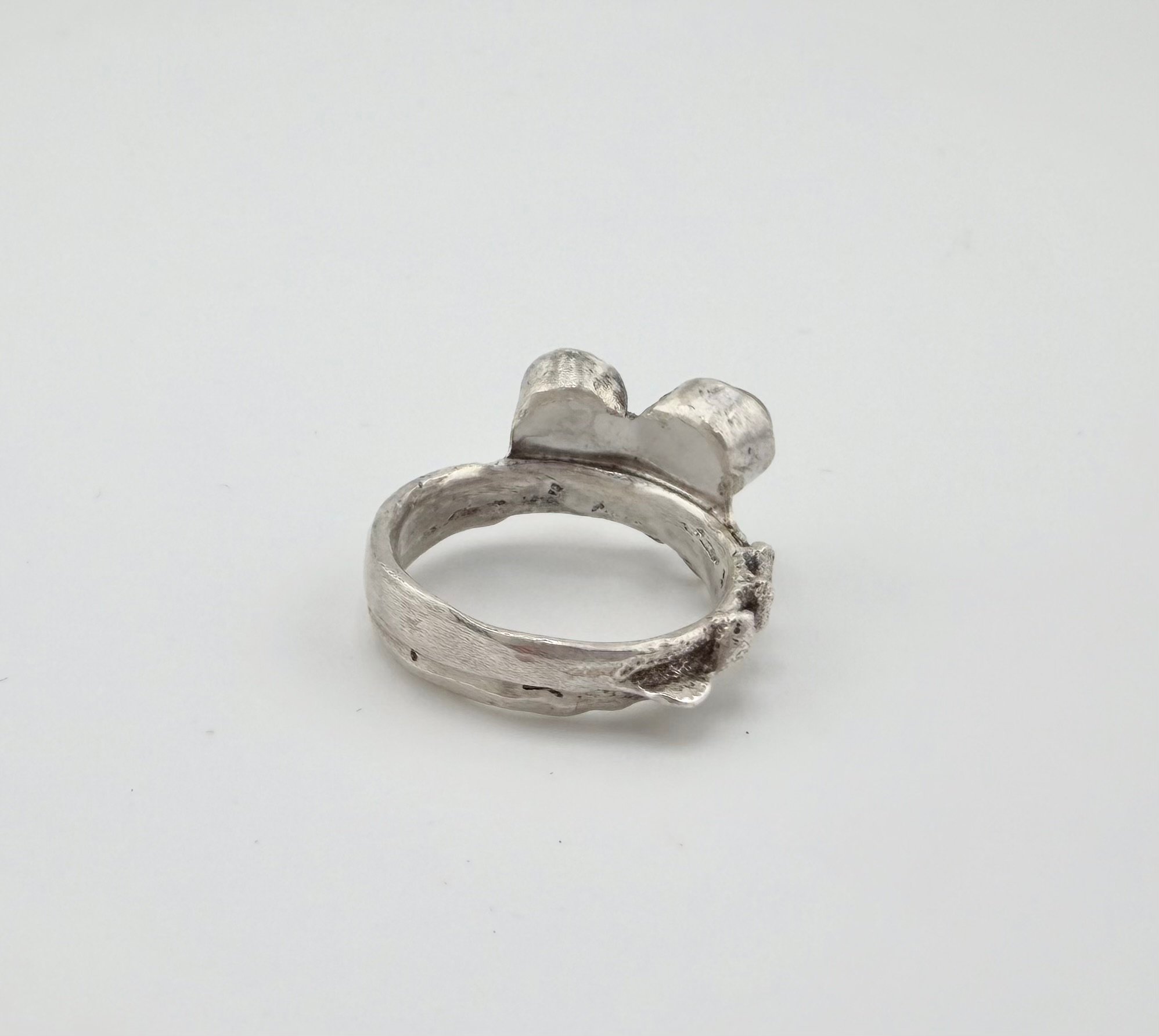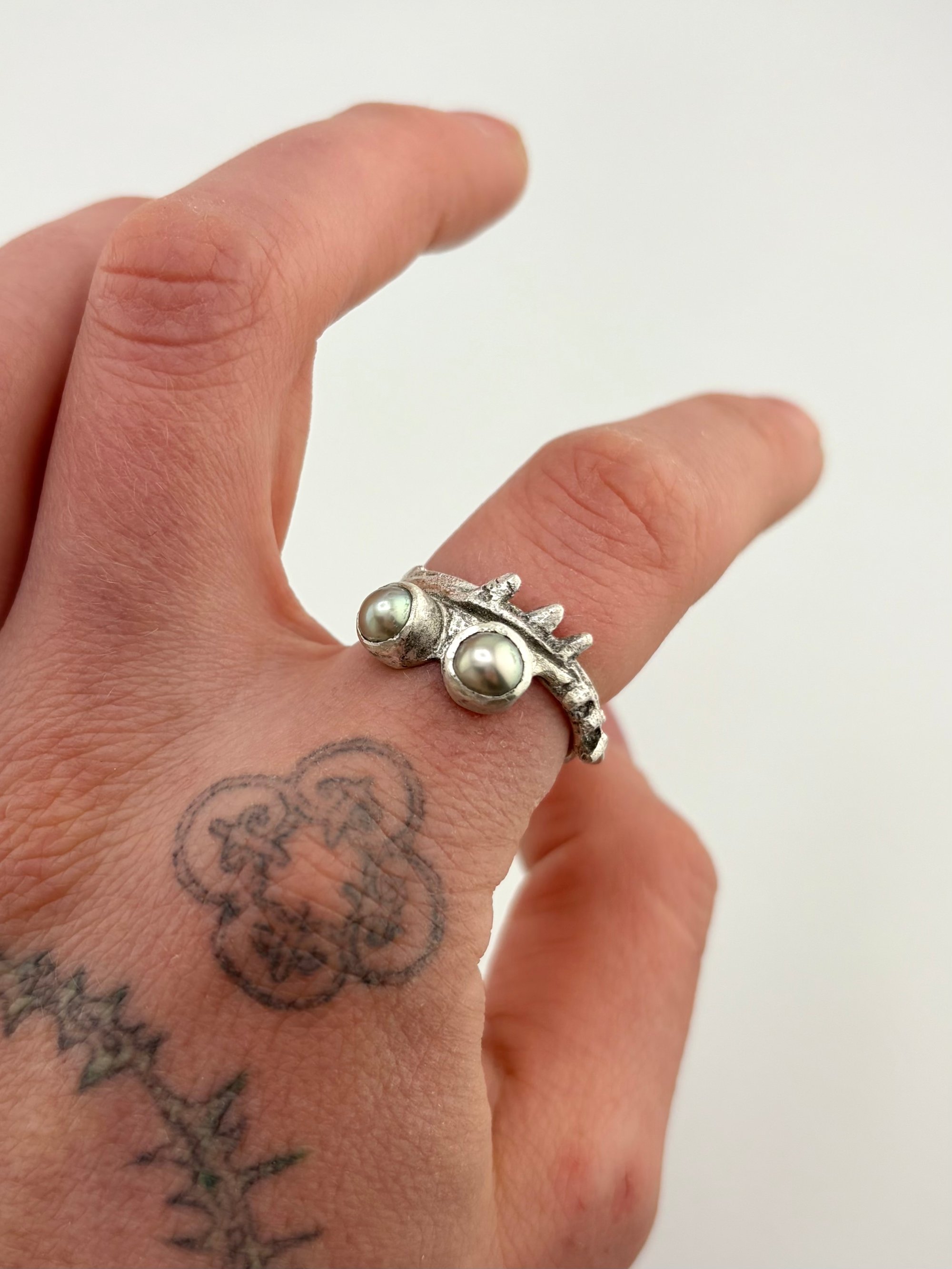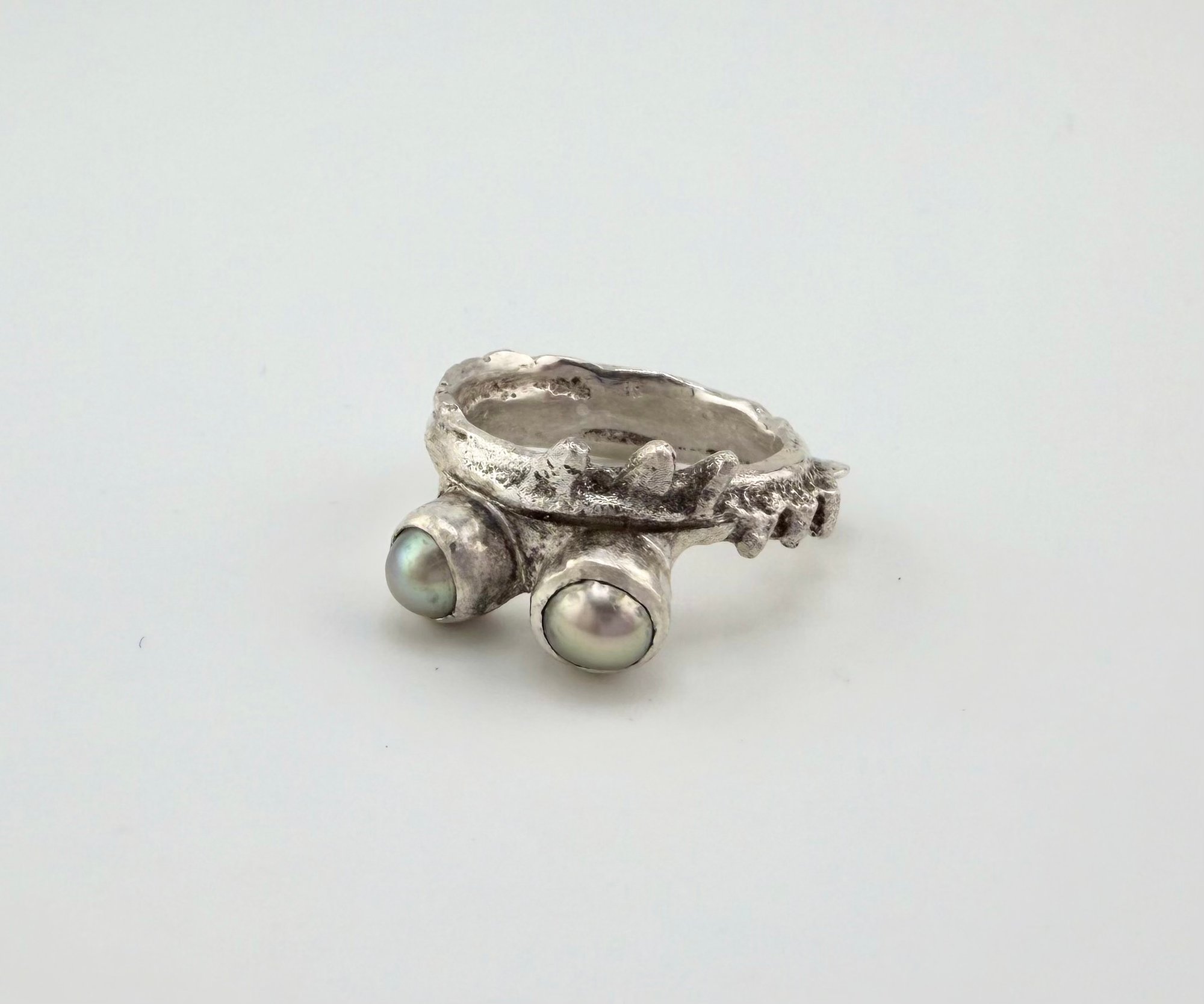 sand cast sterling silver band with two green pearls